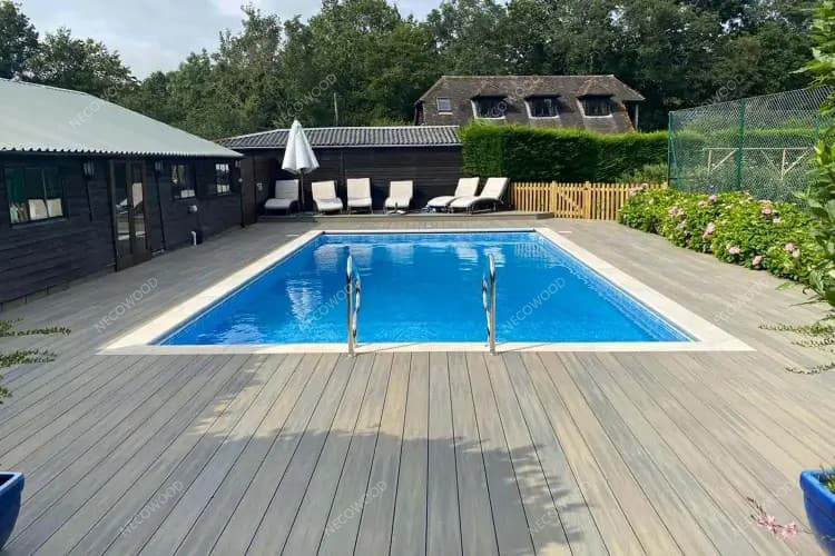 Mit einer großen Farbauswahl, darunter Grau, helles Holz und tiefes Braun, hilft Necowood Architekten und Designern, sowohl moderne als auch klassische Poolumgebungen zu schaffen. Graue Terrassendielen gepaart mit blauem Poolwasser sind eine der beliebtesten Kombinationen in aktuellen Gastgewerbeprojekten.