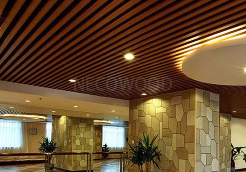Necowood-Deckenpaneele bestehen aus Holz-Kunststoff-Verbundwerkstoff (WPC) – einer Mischung aus natürlichen Holzfasern und hochwertigen Polymeren – und fangen die Wärme und Schönheit von echtem Holz ein, während Probleme wie Verziehen, Risse oder häufige Wartung vermieden werden.