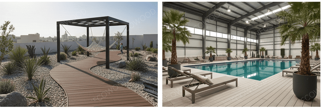 NECOWOOD produziert HochleistungsprodukteTerrassendielen aus Holz-Kunststoff-Verbundwerkstoffspeziell für den Nahen Osten. Unsere Platten verfügen über fortschrittliche Lichtstabilisatoren, um die Langlebigkeit der Farben in Umgebungen mit hoher UV-Strahlung zu gewährleisten.